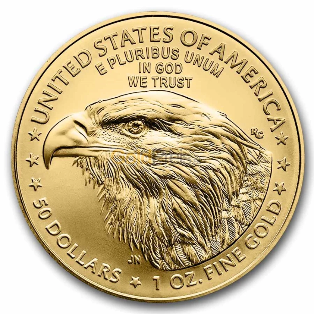 In der Mitte der American Eagle Goldmünze ist ein Weißkopfseeadler (eng. Eagle) zu sehen, in dessen Schnabel sich ein Olivenzweig befindet und der sich gerade im Anflug zu seinem Nest befindet. Dort erwarten ihn ein weiblicher Adler und ihre hungrigen Jungen. Über dem Motiv, steht am obereren Münzrand geschrieben „UNITED STATES OF AMERICA“. Am unteren Münzrand des American Eagle verlaufen die Angaben zu Stückelung, Feingehalt und Nennwert: „1 OZ FINE GOLD – 50 DOLLARS“. Zwischen den Seeadlern steht links „E PLURIBUM UNUM“ (Aus vielen Eines) auf der 1 oz Goldmünze und rechts „IN GOD WE TRUST“ (Auf Gott vertrauen wir).