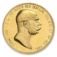 Die 100 Kronen Goldmünze wurde erstmals 1908 geprägt. Im Ersterscheinungsjahr präsentierte sich die große Goldkrone in einer anderen Darstellung als in der Folgezeit. Zum 60. Regierungsjubiläum Kaiser Franz Joseph I. zierte den Avers eine auf Wolken liegende Ruhmesgöttin mit Lorbeerkranz und Wappenschild: Flankiert sie links durch die Angabe des Regierungszeitraums 1848-1908 und links durch den Nennwert von 100 COR.