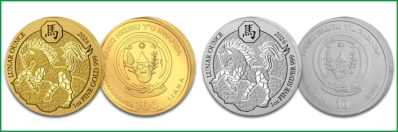 Ebenfalls als Agenturausgabe erscheint die Bullionmünze Ruanda Lunar Gold und Ruanda Lunar Silber. Die 2017 gestartete Serie folgt mit ihren Motiven dem chinesischen Mondkalender der Tierkreiszeichen. Für das Jahr 2026 ist daher das Pferd dargestellt. Als Besonderheit dieser Reihe präsentieren sich die Tiere im abstrakten Mosaikstil, was für einzigartige Effekte sorgt. Das dynamische Design zeigt ein steigendes Pferd mit wehender Mähne und erhobenem Schweif. In die Gestaltung eingefügt ist die Jahrgangsbezeichnung »Year of the Horse« sowie die entsprechenden chinesischen Schriftzeichen. In der Umschrift auf glattem Grund sind zudem der Serienname, das Erscheinungsjahr und die Feindaten integriert. Die Vorderseite bildet das Landeswappen der Republik Ruanda ab, das durch die Landeszentralbank und den Nennwert in Ruanda-Franc (RWF) ergänzt wird.
