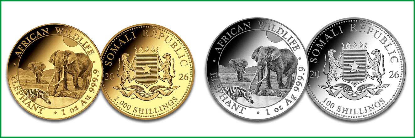 Zu den Klassikern unter den Anlage- und Sammlermünzen zählt die Agenturausgabe Somalia Elefant Gold und Somalia Elefant Silber, die seit 2004 geprägt wird. Sie ist in den Ausführungen Stempelglanz und Polierte Platte erhältlich und wird in vielen attraktiven Stückelungen von 1/50 bis 5 Unzen und von 0,5 Gramm bis 1 Kilogramm angeboten. Ihr Feingehalt liegt bei jeweils 999,9 Tausendstel. Die Münze »African Wildlife Elephant« zeigt auf ihrer Rückseite jährlich wechselnde Elefantenmotive. Der 2026er-Jahrgang präsentiert auf seinem Revers zwei erwachsene Elefanten an einer Wasserstelle in der afrikanischen Steppe. Ein Zebra hat sich dort ebenfalls eingefunden. Die heiße Sonne Afrikas steht über der Szene. Als Umschrift erscheint der Serienname der Münze zusammen mit den Feindaten. Den Avers bildet das Staatswappen der Republik Somalia, die als offizielles Ausgabeland fungiert. Daher erfolgt die Angabe des Nennwerts in Somalia Schillinge.