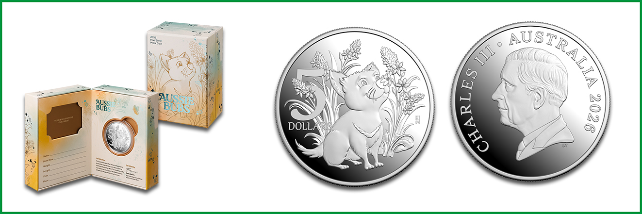 Wer die Ankunft eines Babys im Jahr 2026 zu feiern hat, kann dies stilgerecht mit der Silbermünze aus der Serie »Aussie Bubs« tun, die von der Royal Australian Mint verausgabt wird. Die Rückseite zeigt ein Tasmanisches Teufel-Jungtier, das dabei ist, die Welt zu entdecken. Gestaltet wurde das Design mit dem integrierten Nennwert über 5 Australische Dollar von Elyssa Waterford. Die Vorderseite mit King Charles III. wurde von Dan Thorne entworfen.