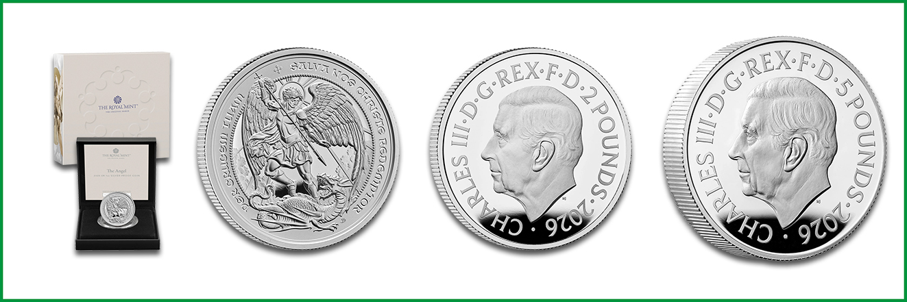 Im Januar 2026 gibt die britische Royal Mint die Silbermünze »The Angel« in den beiden Stückelungen zu 1 und 2 Unzen heraus. Sie zeigt auf ihrer Bildseite eine moderne Interpretation des Erzengels Michael, der den Widersacher Satan in Gestalt eines Drachen tötet. Das Design von Sandra Deiana weist partiell verstärkte Glanzelemente auf, wodurch ein dreidimensionaler Effekt entsteht. Die Inschrift »PER CRUCEM TUAM SALVA NOS CHRISTE REDEMPTOR« bedeutet “Durch dein Kreuz, rette uns, o Christus, unser Erlöser”. Auf der Wertseite ist König Charles III. nach einem Entwurf von Martin Jennings inklusive Nennwert und Jahreszahl zu sehen.