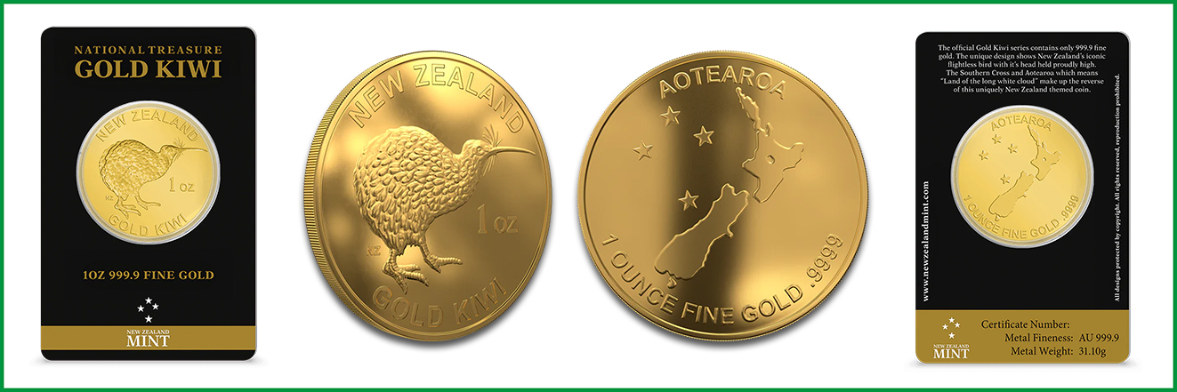 Die New Zealand Mint verausgabt ebenfalls die Goldmünze »Aotearoa Kiwi« in der Stückelung zu einer Unze. Das Rückseitenmotiv des Gold Kiwi bildet einen Schnepfenstrauß ab, der in den Wäldern Neeseelands beheimatet ist. Der flugunfähige nachtaktive Laufvogel ist der kleinste seiner Gattung. “Aotearoa” ist der maorische Name für Neuseeland und bedeutet etwa so viel wie "Land der langen weißen Wolke. Der kulturell bedeutende Name betont die indigene Geschichte des Landes. Er steht für die Kultur der Māori. So zeigt die Vorderseite die beiden Hauptinseln Neuseelands zusammen mit den Feindaten.