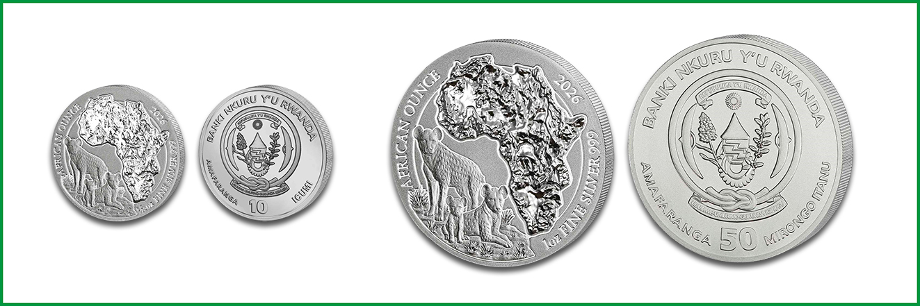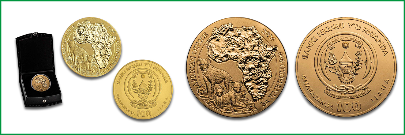 | Ruanda African Ounce 2026 | 1/12 oz Gold | 1 oz Gold | 1/12 oz Silber | 1 oz Silber |