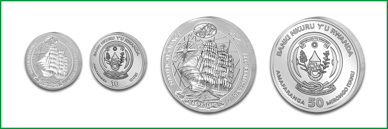 Die Serie Nautical Ounce wird seit 2017 als lizensierte Agenturausgabe in Deutschland für den afrikanischen Staat Ruanda produziert. Nautical Ounce Gold und Nautical Ounce Silber zeigen jährlich wechselnde Motive mit historischen Segelschiffen, die einst unsere Weltmeere befuhren. Das Design für 2026 stellt das Frachtsegelschiff »Kruzenshtern« dar, das 1926 unter der Bezeichnung “Padua” in Wesermünde (heute Bremerhaven) vom Stapel lief. In den 1930er- und 1940er-Jahren diente es vielfach als Filmkulisse. Seit 1946 befindet sich der Großsegler im Besitz Russlands und wird bis heute als Schulschiff eingesetzt. Die Münze würdigt das 100-jährige Jubiläum des Rahsegelschiffs.