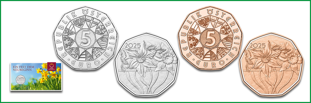 Die Narzisse begeistert uns im Frühjahr mit ihren wunderschönen Blütenkelchen und den satten grünen Blattern. Mittelpunkt des Münzdesigns ist eine Komposition aus unterschiedlichen Arten, die in Österreich beheimatet sind: Stern-Narzisse (links), Dichter-Narzisse (Mitte) und gelbe Narzisse (rechts). Die Wertseite mit dem Nennwert über 5 Euro zeigt die neun Landeswappen Österreichs in kreisförmiger Anordnung. Entwickelt wurden die Münzdesigns von den Graveuren Mag. Helmut Andexlinger, Anna Schlindner und Rebecca Wilding.