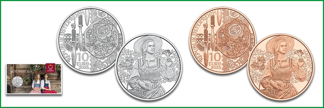 Mit der vierteiligen Serie »gschneizt & kampelt« wird die Trachtenkultur Österreichs gefeiert. Den Auftakt macht das Motiv “Aufdirndln Leinen”. So stellt das Rückseitenmotiv eine Frau mit Hut in einem traditionellen Dirndl mit schwingenden Rock und kunstvollen Details dar. Der Avers mit dem Nennwert über 10 Euro zeigt Elemente aus dem Schneiderhandwerk mit Garnrollen und fein gearbeiteter Spitze. Entwickelt wurden die Designs von Anna Schlindner und Elena Dolgova.