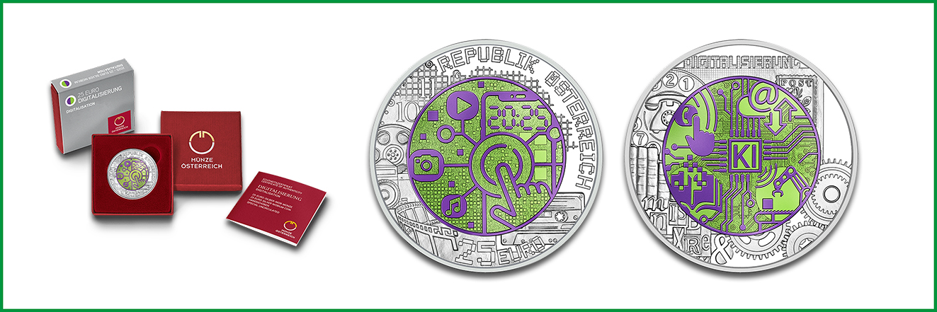 Die Serie der Niobmünzen wird seit 2003 von der Münze Österreich mit jährlich wechselnden Motiven ausgegeben. In diesem Jahr sind die Motive von Vorder- und Rückseite der Digitalisierung gewidmet. Sie stellt die Bereiche Kommunikation, Handel, Bildung und Kunst dar, die sich durch den digitalen Wandel verändern. Dabei stehen moderne Errungenschaften wie Blockchain-Technologie, Künstliche Intelligenz (KI) und smarte Geräte mit ihren entsprechenden Symbolen im Fokus. Die Graveurinnen Kathrin Kuntner und Rebecca Wilding sind für die Gestaltung verantwortlich. Das Besondere an den Niobmünzen ist ihre zweifarbige Aufmachung. Durch die Lichtbrechung des Niobkerns (998/1000 Niob) erscheint dieser in Grün und Blau, obwohl keine Färbung zum Einsatz kommt. Der äußere Bereich besteht aus 900 Tausendstel Silber und stellt einen eleganten Kontrast her.