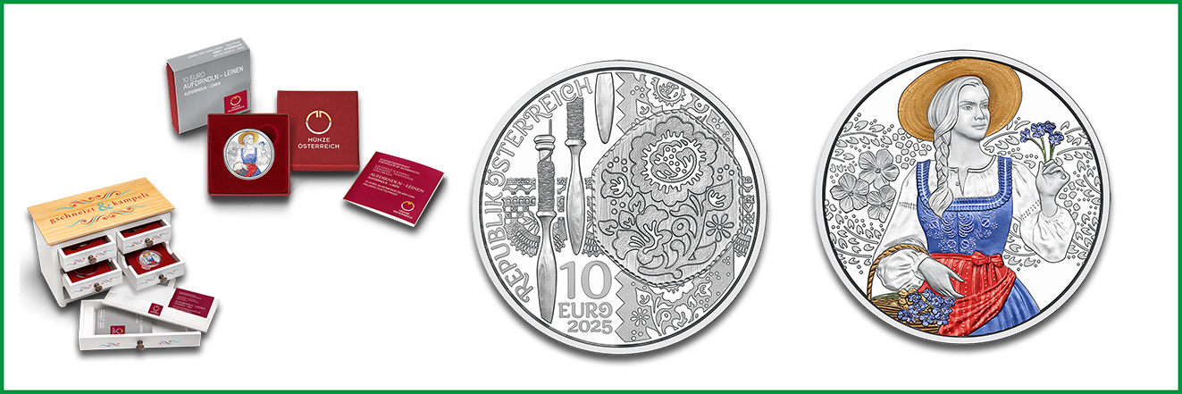 Trachtenmünzen “Aufdirndln Leinen” 10 Euro 2025 in drei Ausführungen