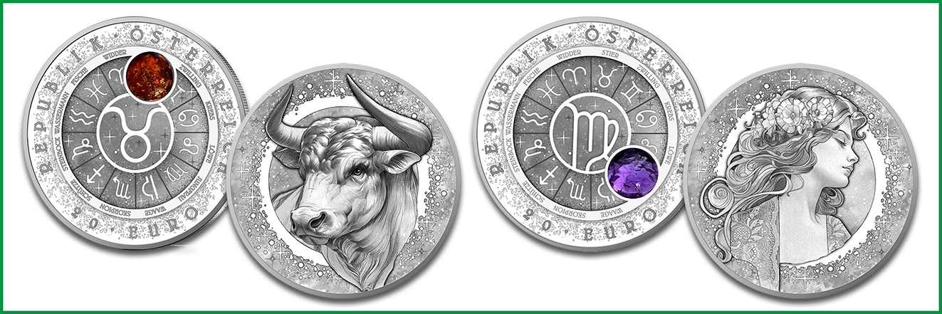 Mit der neuen 12-teiligen Horoskop-Serie »Sternbilder« bringt die Münze Österreich zwischen 2025 und 2029 hochwertige Silbermünzen zu 20 Euro heraus. Der Bildseite ist ganz den bekannten Tierkreiszeichen vorbehalten. Den Auftakt macht das Motiv “Steinbock” das im November 2025 erscheinen soll. Als Besonderheit ist die Wertseite mit verschiedenen Edelsteinen verziert, welche die Eigenschaften des jeweiligen Sternzeichens unterstützen und ausgleichen sollen. So soll etwa der Stier mit einem Bernstein innere Ruhe gewinnen und die Jungfrau wird von einem Amethyst begleitet. Platziert sind die Edelsteine auf dem jeweiligen Symbol des Tierkreiszeichens.