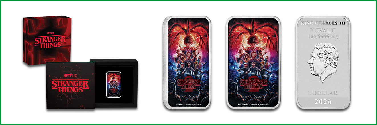 Die australische Prägestätte Perth Mint widmet der beliebten Netflix-Serie »Stranger Things« eine neue Münzreihe. Den Auftakt machen die beiden Poster-Designs der Staffeln 1 und 2. Die US-amerikanische Science-Fiction-Mystery-Serie spielt in den 1980er-Jahren im fiktiven Ort Hawkins im Bundesstaat Indiana. Im Mittelpunkt stehen vier befreundete Jungen und das Mädchen Elfi (Eleven), das über psychokinetische Fähigkeiten verfügt. Ihre Abenteuer führen sie an die Schauplätze bekannter Filmklassiker wie etwa “E.T.”, " Poltergeist" oder “Zurück in die Zukunft”.