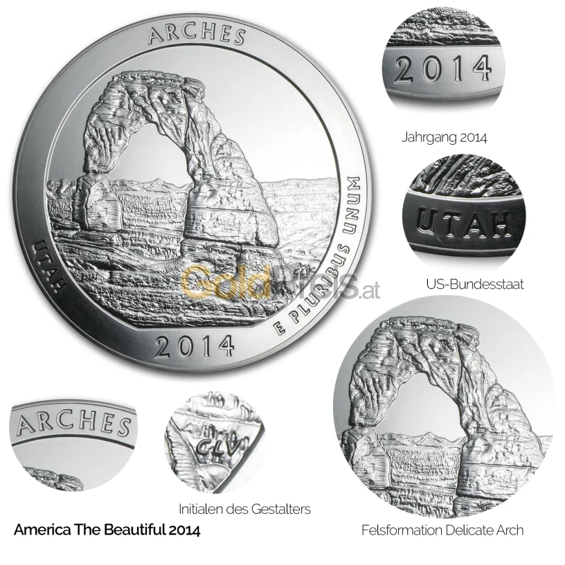 Die „America the Beautiful“-Serie präsentiert auf der Vorderseite den ersten Präsidenten der Vereinigten Staaten Amerikas, George Washington. Sein Konterfei ziert bis heute die US-amerikanischen Umlaufmünzen. Am glatten Rand der Münze verläuft die Inschrift: „.999 FINE SILVER 5.0 OUNCE“. Auf der Rückseite dieser eindrucksvollen Silbermünzen erscheint jährlich eine andere Sehenswürdigkeit der Vereinigten Staaten Amerikas.
