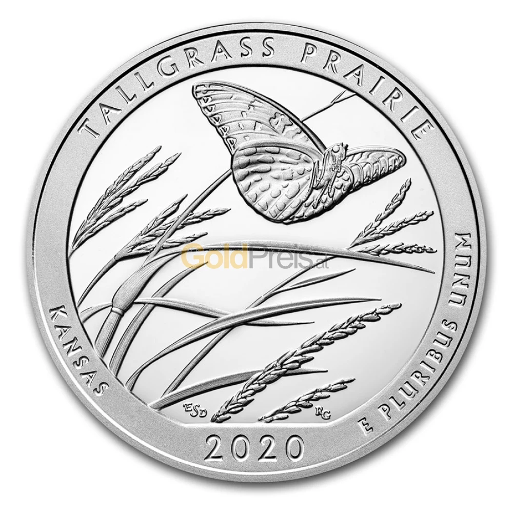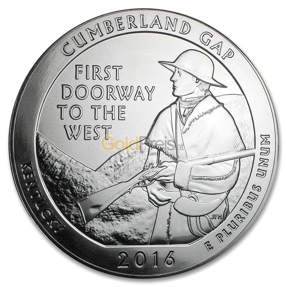 Die 21. Silbermünze zeigt den „Great Smoky Moutains“ Nationalpark im Bundesstaat Tennessee. Auf der Münze ist eine Holzhütte abgebildet, die idyllisch in der waldreichen Landschaft des Mittleren Ostens der USA liegt. Über dem Horizont schwebt ein Habicht auf der Suche nach Beute.