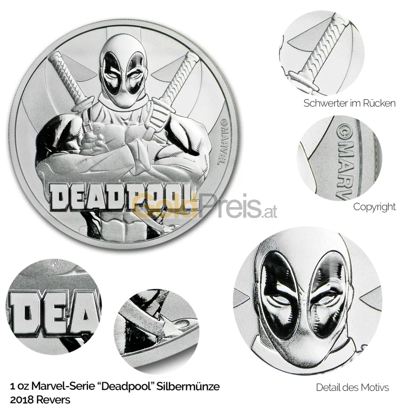 Charakteristisch ist die von Comic-Buchautor Rob Liefeld erschaffene Figur auf der Münzrückseite mit zwei Schwertern auf dem Rücken dargestellt, die schnell hervorgezogen werden können. Mit verschränkten Armen schaut der Racheengel seinem Betrachter entgegen. Im Hintergrund ist ein Wappen erkennbar. Prominent prangt der Schriftzug »DEADPOOL« im Vordergrund, sowie seitlich dezent das Marvel-Copyright.