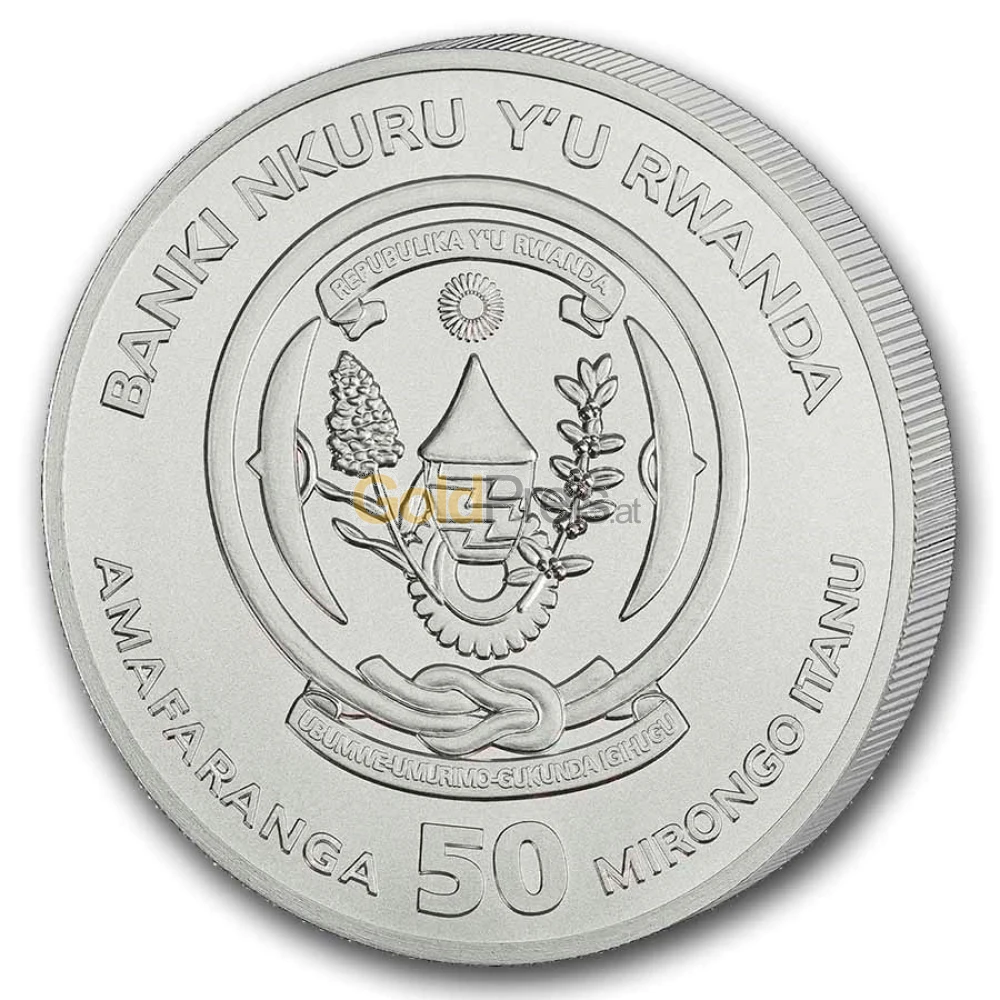 Nennwert: 50 Ruandische Francs (RWF), Edelmetall: Silber, Feinheit: 999/1000, Gewicht: 31,103 g = 1 Unze, Durchmesser: 40 mm, Rand: geriffelt